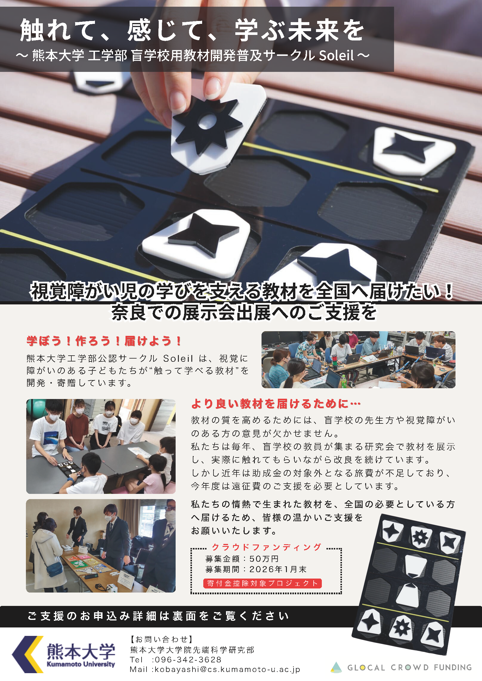 熊本大学第9号クラウドファンディングとして、「触れて、感じて、学ぶ未来を~視覚障がい児の学びを支える教材を全国へ届けたい!奈良での展示会出展へのご支援を~」を公開いたしました。